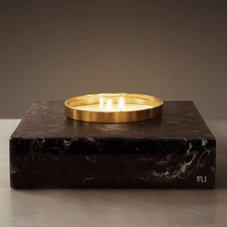 Designed and produced in partnership with Lily Juliet, the Solna Resin Tray is a striking work of art in hand-cast resin. Each tray is paired with a gleaming gold bowl that holds a candle poured in your choice of fragrance, creating a centerpiece that seduces both the eye and the senses. Luminous, sculptural, and undeniably chic, this piece is as much an objet as it is a candle. The Solna is sold in a custom matte black gift box that elevates the unboxing into an experience of its own. The tray and bowl together are made to stand alone in beauty long after the wax has burned away. Refill the bowl with a new candle insert, cradle treasures inside, or leave it empty to showcase its pure, sculptural form. Each Solna piece is hand-crafted and unique, with natural swirls and variations in the resin so that each is one-of-a-kind.